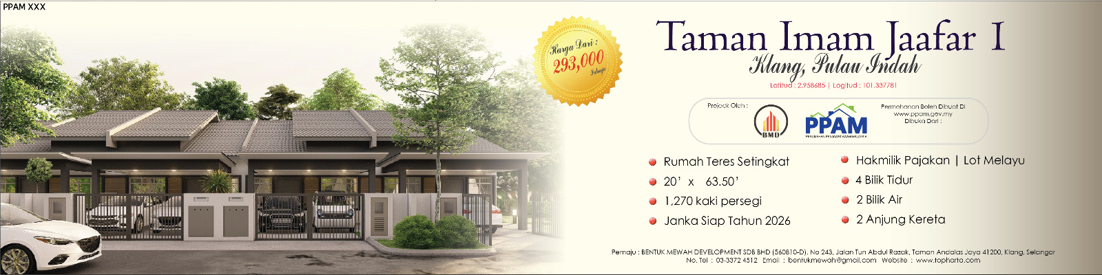 KAMI INGIN MEMPERKENALKAN PROJEK TERBARU KAMI IAITU TAMAN IMAM JAAFAR 1 YANG TERLETAK DI PULAU INDAH, KLANG SELANGOR. PROJEK INI BERKELUASAN 1.519 EKAR YANG MENGANDUNGI 24 UNIT RUMAH TERES SETINGKAT. PERUMAHAN INI MEMPUNYAI 4 BILIK TIDUR DAN 2 BILIK TIDUR DAN KELUASAN BINAAN MELIPUTI 953 KAKI PERSEGI. IA JUGA BERHAMPIRAN DENGAN KEMUDAHAN FASILITI BAGI MEMUDAHKAN PENDUDUK DI PERUMAHAN INI SEPERTI KEDAI KUNCIT, SURAU, TADIKA DAN DEWAN SERBAGUNA.