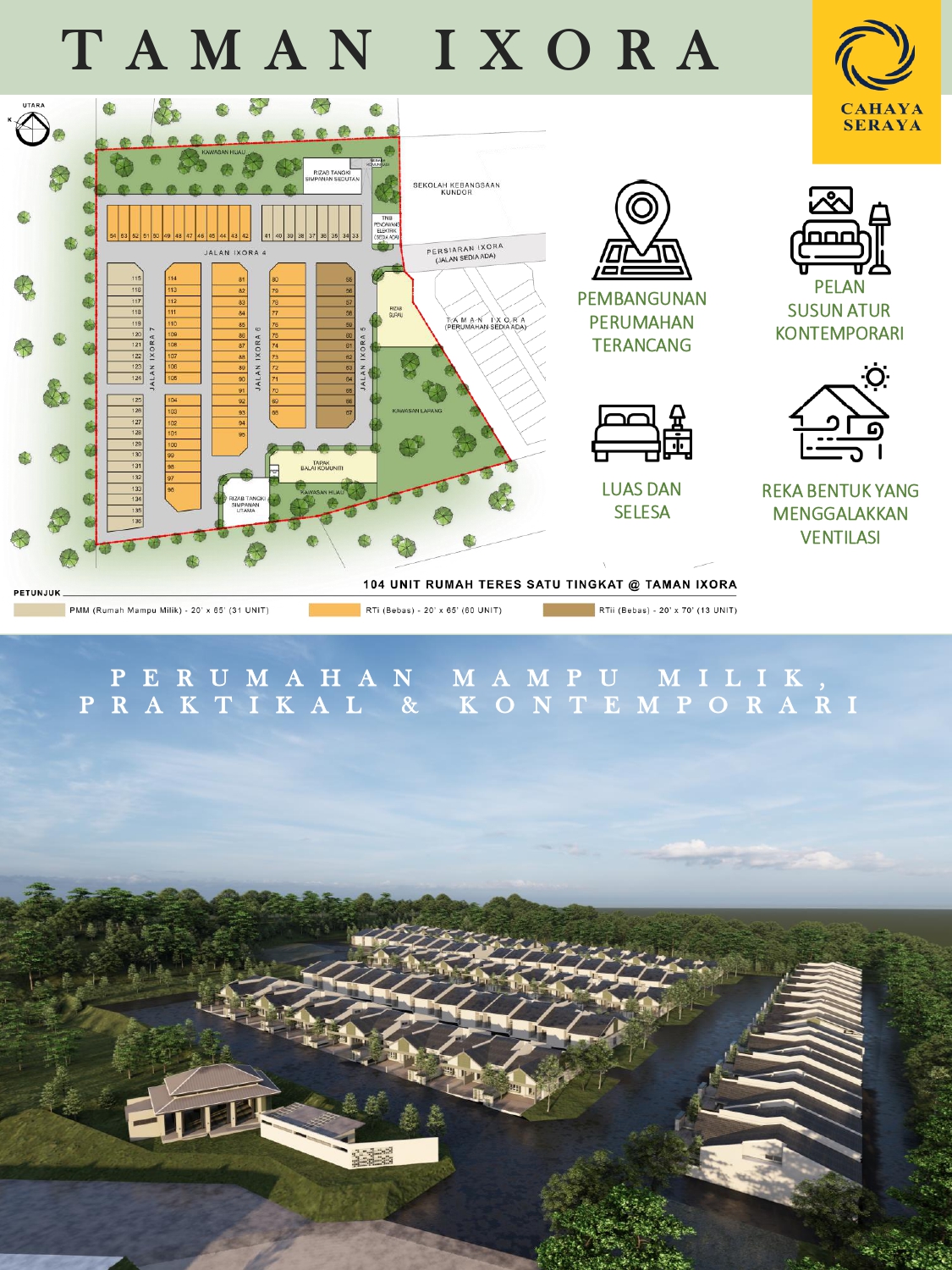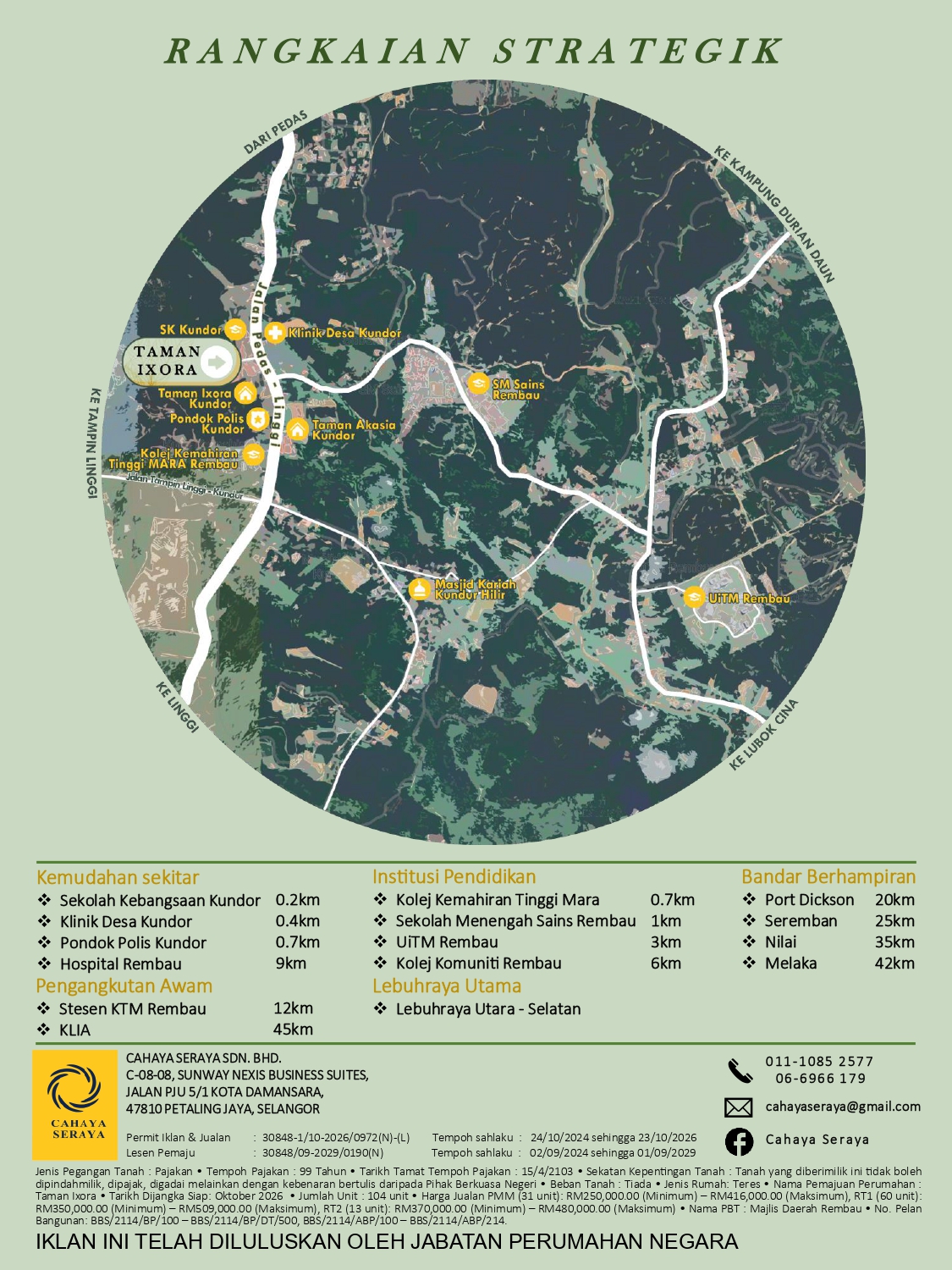 48 UNIT RUMAH TERES SATU TINGKAT (20’ X 65’) UNTUK DIJUAL BERSTATUS RIZAB MELAYU, BERSEBELAHAN DENGAN SEKOLAH KEBANGSAAN KUNDOR, KOLEJ KEMAHIRAN TINGGI MARA, KLINIK DESA KUNDOR DAN PONDOK POLIS KUNDOR, SERTA DILENGKAPI DENGAN 1 UNIT SURAU YANG TERLETAK DI MUKIM KUNDOR, DAERAH REMBAU, NEGERI SEMBILAN, BAGI TETUAN CAHAYA SERAYA SDN. BHD.