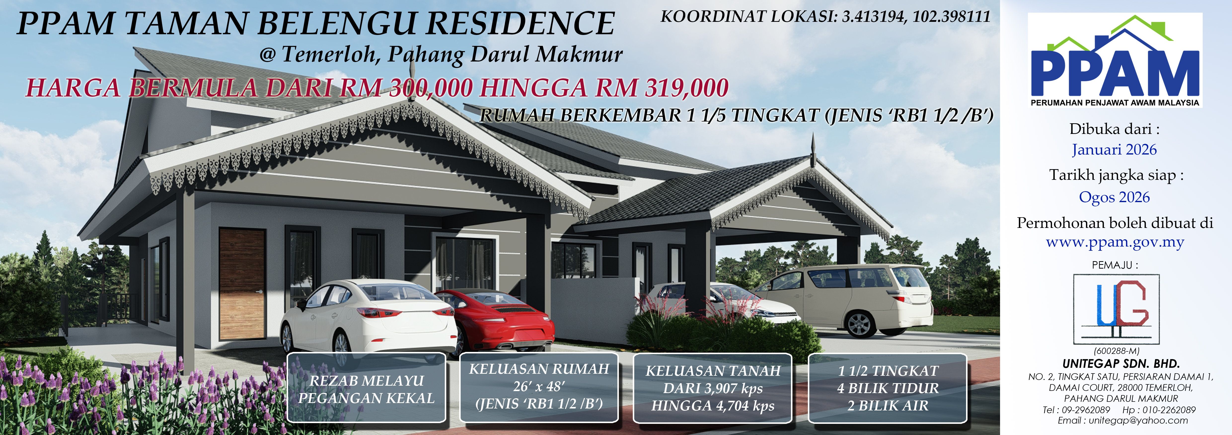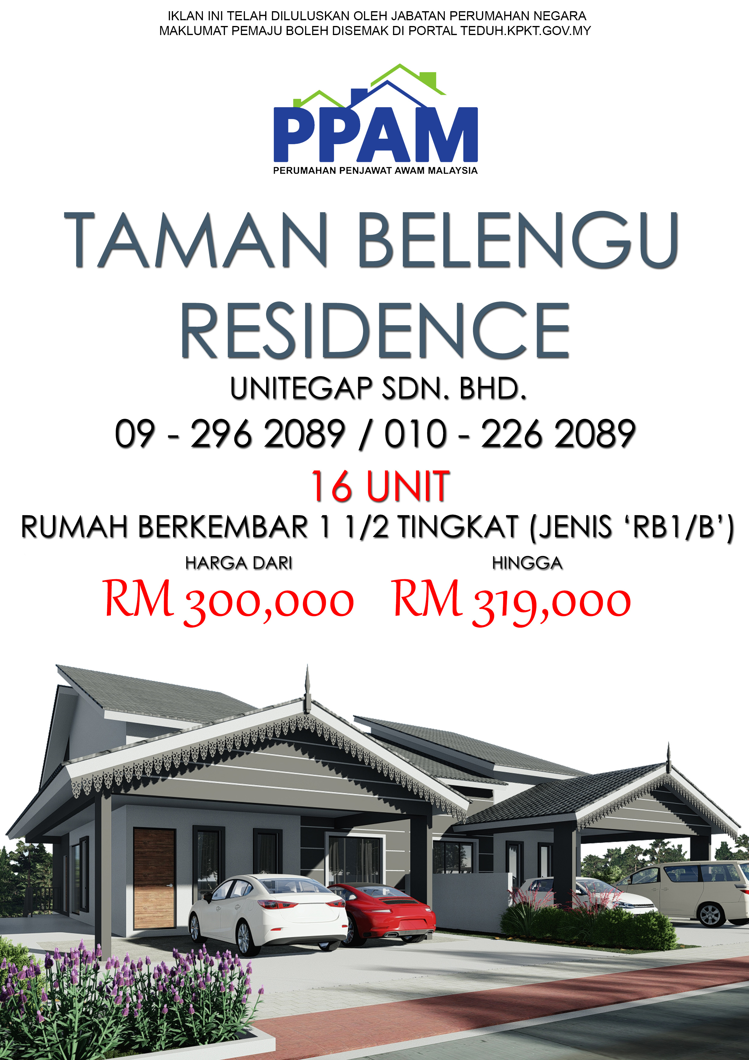 PPAM TAMAN BELENGU RESIDENCE YANG MEMPUNYAI 16 UNIT RUMAH BERKEMBAR SATU TINGKAT SETENGAH YANG MENGANDUNGI UNIT KELUASAN 1,645 KAKI PERSEGI. PROJEK INI TERLETAK DI KAWASAN BELENGU, DAERAH TEMERLOH, PAHANG DARUL MAKMUR. TAPAK PROJEK INI TERLETAK 1.5KM DARI SEKOLAH KEBANGSAAN BELENGU DAN MASJID KG BELENGU. SELAIN ITU, BALAI BOMBA DAN PENYELAMAT DAERAH TEMERLOH DAN IBU PEJABAT POLIS DAERAH TEMERLOH JUGA TERLETAK 6KM DARI TAPAK PROJEK TERSEBUT. SETERUSNYA, TERDAPAT JUGA SEKOLAH-SEKOLAH, KLINIK DAN PELBAGAI PEJABAT-PEJABAT KERAJAAN BERADA DI DALAM LINGKUNGAN 10KM DARI TAPAK PROJEK INI. HARGA JUALAN UNTUK RUMAH BERKEMBAR SETINGKAT SETENGAH BERMULA DARI RM300,000.00 SEHINGGA RM319,000.00. HARGA YANG DITAWARKAN ADALAH LEBIH MURAH DARIPADA HARGA PASARAN.