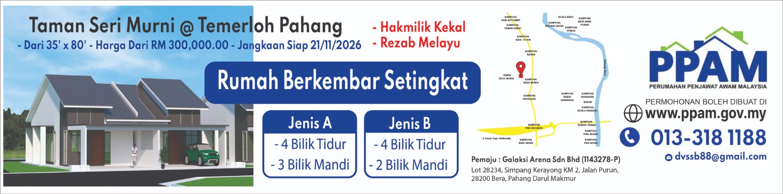 PPAM TAMAN SERI MURNI IALAH SEBUAH PROJEK PERUMAHAN YANG DIBANGUNKAN DI TEMERLOH, PAHANG. REKA BENTUK MODEN RUMAH JENIS SEMI-D INI DIBINA DENGAN SPESIFIKASI YANG LEBIH TINGGI. PROJEK INI DILAKSANAKAN BAGI MENYEDIAKAN KEDIAMAN YANG SELESA DAN BERKUALITI KEPADA PENDUDUK SETEMPAT PADA HARGA YANG BERPATUTAN.