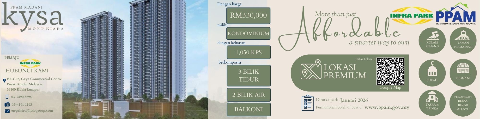 PPAM KYSA @ MONT KIARA MENAWARKAN KOMBINASI UNIK CIRI-CIRI KEMEWAHAN PADA KEDIAMAN ANDA DENGAN HARGA YANG ISTIMEWA:- ⦁ LOKASI PREMIUM: MONT KIARA, KUALA LUMPUR. ⦁ KATEGORI TAPAK PROJEK: PEGANGAN BEBAS, REZAB MELAYU. ⦁ RUANG LUAS: SETIAP UNIT DENGAN KELUASAN 1,050 KAKI PERSEGI. ⦁ HARGA ISTIMEWA: RM330,000 SELEPAS DANA MUDAH CARA IM-PPAM. ⦁ FASILITI EKSKLUSIF: KOLAM RENANG, DEWAN SERBAGUNA, SURAU, TADIKA, TASKA, RUANG LEGAR DAN TAMAN PERMAINAN. ⦁ AKSES MUDAH: LEBUHRAYA SPRINT, LEBUHRAYA UTARA-SELATAN (NKVE), DUKE, DASH & LDP. ⦁ PENGANGKUTAN AWAM: CADANGAN STESEN MRT3 MONT KIARA (1.3KM). ⦁ KEMUDAHAN BERDEKATAN: 1 # PUSAT KOMERSIAL – JAYA GROCER, VERVE SHOPS, VALUE BAZAAR, PLAZA MONT KIARA, 163 RETAIL PARK, 1MONT KIARA, HYATT HOUSE, IKEA DAMANSARA, 1UTAMA, SOLARIS MONT KIARA, PUBLIKA, PLAZA ARKADIA, PAVILION DAMANSARA, LOTUS KEPONG DLL.; 2 # INSTITUSI PENDIDIKAN – SK SRI HARTAMAS, SMK SRI HARTAMAS, GARDEN INTERNATIONAL SCHOOL, UNIVERSITI MALAYA DLL.; 3 # INSTITUSI KESIHATAN – KLINIK KESIHATAN SEGAMBUT, PUSAT PERUBATAN UNIVERSITI MALAYA, KPJ DAMANSARA 2, GLOBAL DOCTORS HOSPITAL, DAN LAIN-LAIN KLINIK SERTA HOSPITAL SWASTA; 4 # INSTITUSI KEWANGAN – BANK RAKYAT, MAYBANK, BANK ISLAM, BANK RHB, HSBC BANK, AMBANK DLL.; 5 # PUSAT KESENGGANGAN & REKREASI – TAMAN PERSEKUTUAN BUKIT KIARA, TAMAN REKREASI LEMBAH KIARA TTDI KL, PUSAT SAINS NEGARA, KL GOLF COUNTRY CLUB, BUKIT KIARA EQUESTRIAN & COUNTRY RESORT, KIDZANIA KUALA LUMPUR, THE NEW CAMP BANDAR UTAMA, SPORTS N' PLAY 1 UTAMA DLL. ⦁ TERLETAK DI ANTARA KEHIJAUAN ALAM, KEMEWAHAN KEJIRANAN, KEMODENAN BANDAR, KESELESAAN SERTA KEMUDAHAN INFRASTRUKTUR, PPAM KYSA KIARA ADALAH PILIHAN SEMPURNA BAGI ANDA YANG MENGHARGAI GAYA HIDUP BERKUALITI TINGGI DI BANDARAYA KUALA LUMPUR. IA MENAWARKAN GABUNGAN UNIK KETENANGAN, KEMEWAHAN DAN KESELESAAN DENGAN HARGA YANG ISTIMEWA.