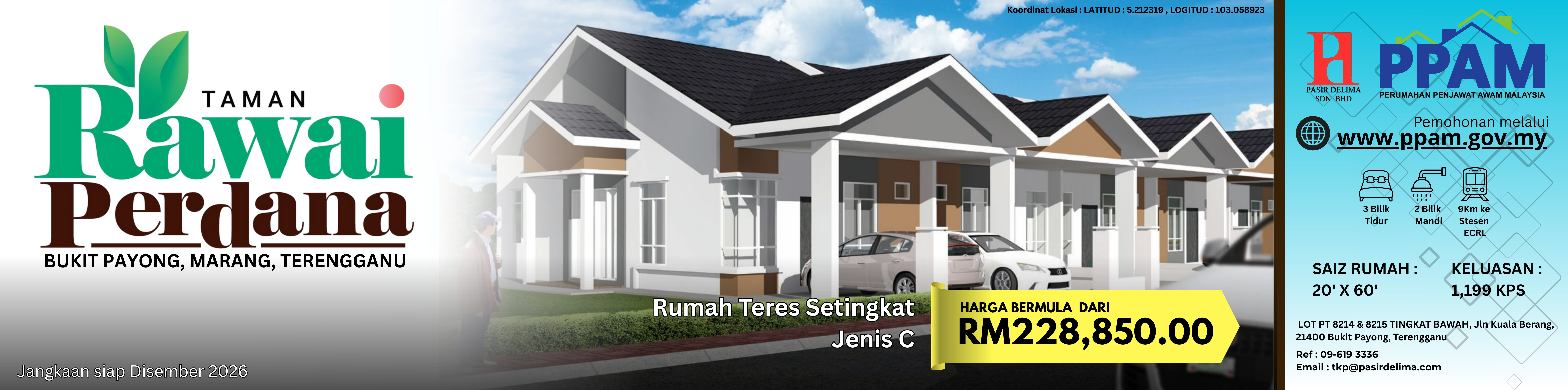 TAMAN RAWAI PERDANA TERDIRI DARIPADA 128 UNIT RUMAH TERES SATU TINGKAT (20’ X 60’, JENIS C) DENGAN KELUASAN BINAAN 901 KAKI PERSEGI SETIAP UNIT. PROJEK INI TERLETAK DI DAERAH MARANG, MUKIM ALUR LIMBAT, TERENGGANU DARUL IMAN. LOKASI PROJEK BERADA DI KAWASAN AMAN DAN DAMAI, SESUAI UNTUK KEHIDUPAN KELUARGA. RUMAH-RUMAH DIREKA UNTUK KESELESAAN MAKSIMUM, DENGAN PENCAHAYAAN SEMULA JADI YANG BAIK, PENGUDARAAN OPTIMUM, DAN SUSUN ATUR YANG PRAKTIKAL. PROJEK INI JUGA DILENGKAPI DENGAN KEMUDAHAN ASAS DAN INFRASTRUKTUR LENGKAP, MENJADIKAN TAMAN RAWAI PERDANA PILIHAN IDEAL UNTUK KEDIAMAN SENDIRI. SELAIN ITU, TANAH PEGANGAN BEBAS MEMBERI NILAI TAMBAH JANGKA PANJANG MENJADIKAN TAMAN RAWAI PERDANA BUKAN SAHAJA SESUAI UNTUK DIDIAMI TETAPI JUGA SEBAGAI PELABURAN MASA HADAPAN. SALAH SATU TARIKAN UTAMA TAMAN RAWAI PERDANA IALAH LOKASINYA YANG STRATEGIK BERHAMPIRAN PEMBANGUNAN ECRL, YANG MENAWARKAN AKSES DAN RANGKAIAN PERHUBUNGAN YANG LEBIH BAIK KE BANDAR-BANDAR UTAMA. PEMBANGUNAN INI DIJANGKA MENINGKATKAN KEMUDAHAN PERJALANAN, MEMACU PERTUMBUHAN KAWASAN SEKITAR SERTA MENAMBAH NILAI HARTANAH, SEKALI GUS MENJADIKANNYA PILIHAN MENARIK UNTUK PEMBELI RUMAH DAN PELABUR JANGKA PANJANG. HARGA JUALAN BAGI RUMAH TERES SATU TINGKAT (JENIS C) INI BERMULA RM228,850 DAN KE ATAS. TAMAN RAWAI PERDANA MENAWARKAN PELUANG TERBAIK UNTUK MEMILIKI RUMAH PERTAMA YANG SELESA DAN MAMPU MILIK.