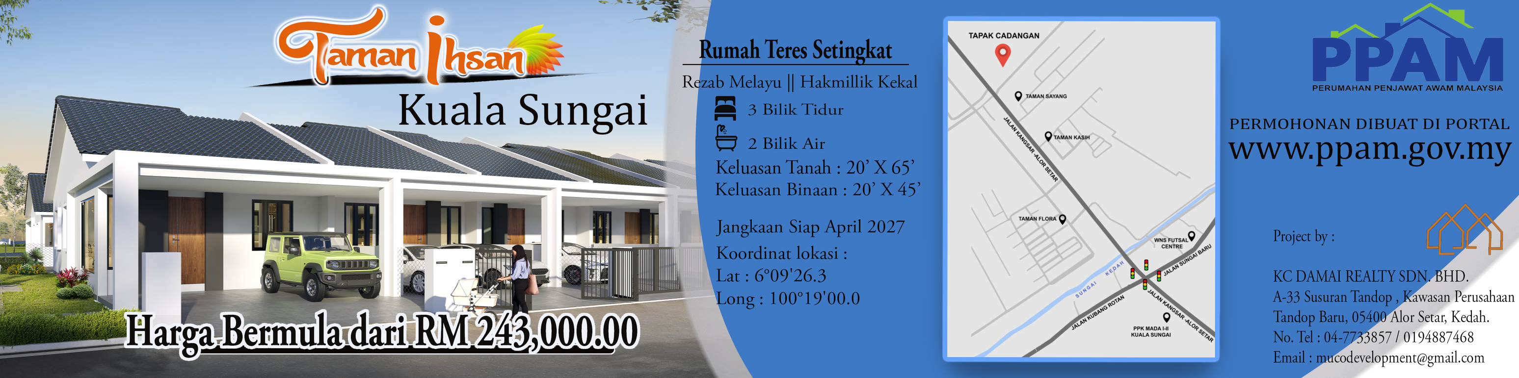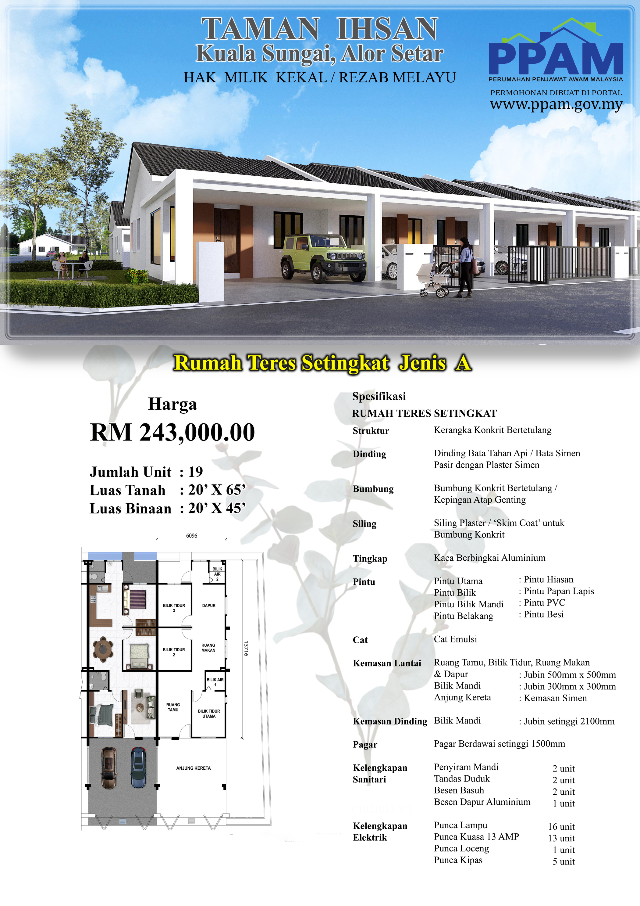 PPAM TAMAN IHSAN MENAWARKAN RUMAH MAMPU MILIK YANG DIKHASKAN UNTUK PENJAWAT AWAM. TERLETAK DI LOKASI YANG STRATEGIK BERSEBELAHAN JALAN UTAMA ALOR SETAR–KANGAR, PROJEK INI MENYEDIAKAN AKSES YANG MUDAH KE SEKOLAH, PASAR, KLINIK SERTA PELBAGAI KEMUDAHAN HARIAN TERMASUK LOTUS’S MERGONG. DIKELILINGI OLEH SUASANA YANG TENANG DAN KEHIJAUAN SEMULA JADI, IA SANGAT SESUAI UNTUK KELUARGA YANG MEMENTINGKAN KESELESAAN DAN KETENANGAN HIDUP. TAMBAHAN PULA, TAPAK PROJEK INI BERLATARBELAKANGKAN PEMANDANGAN INDAH GUNUNG KERIANG SERTA TERLETAK DI KAWASAN YANG BEBAS DARIPADA RISIKO BANJIR. RUMAH JENIS TERES SETINGKAT INI DILENGKAPI DENGAN 3 BILIK TIDUR DAN 2 BILIK AIR, DENGAN KELUASAN BINAAN 20’X45’ SERTA KELUASAN TANAH 20’X65’. REKA BENTUKNYA YANG MODEN DAN PRAKTIKAL DISESUAIKAN DENGAN GAYA HIDUP MASA KINI, MENJADIKAN PROJEK INI PILIHAN YANG IDEAL UNTUK ANDA MEMILIKI HARTANAH PERTAMA.