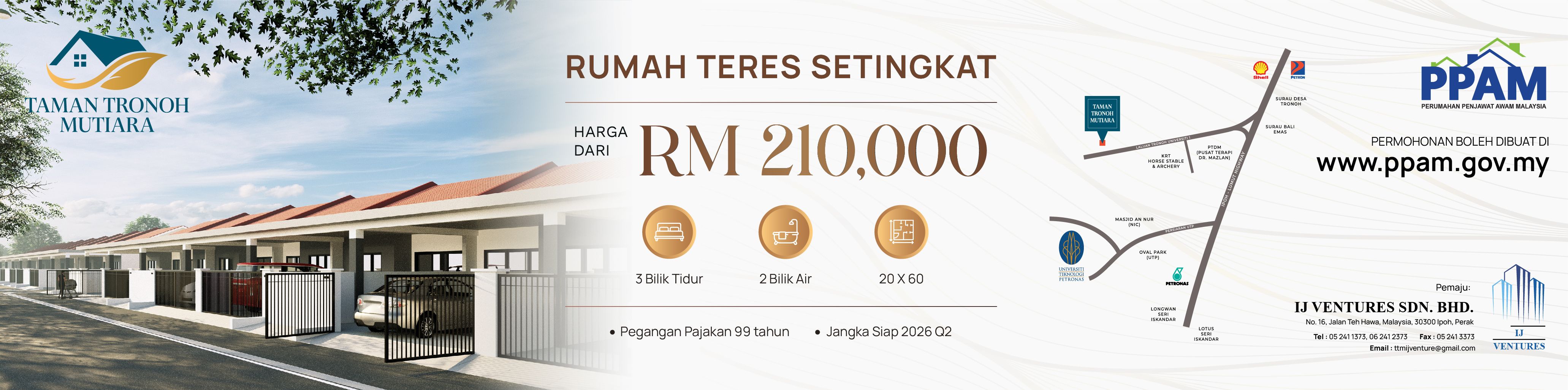 TAMAN TRONOH MUTIARA MERUPAKAN PROJEK PERUMAHAN MAMPU MILIK YANG DIREKA UNTUK MENAWARKAN KEDIAMAN SELESA DAN PRAKTIKAL KEPADA KELUARGA SERTA PEMBELI RUMAH PERTAMA. SETIAP UNIT DIBINA DI ATAS TANAH BERSAIZ 20 KAKI X 60 KAKI DAN DILENGKAPI DENGAN 3 BILIK TIDUR, 2 BILIK AIR, 1 RUANG TAMU, 1 BILIK UTILITI, DAN 1 DAPUR, SESUAI UNTUK KEPERLUAN KEHIDUPAN HARIAN. PROJEK INI TERLETAK DI LOKASI STRATEGIK BERHAMPIRAN KEMUDAHAN UTAMA SEPERTI UNIVERSITI TEKNOLOGI PETRONAS (UTP), UNIVERSITI TEKNOLOGI MARA (UITM), BANDAR SERI ISKANDAR YANG PESAT MEMBANGUN, BATU GAJAH, LOTUS’S, DAN MCDONALD’S, MENJADIKANNYA PILIHAN IDEAL UNTUK DIDIAMI ATAU SEBAGAI PELABURAN.