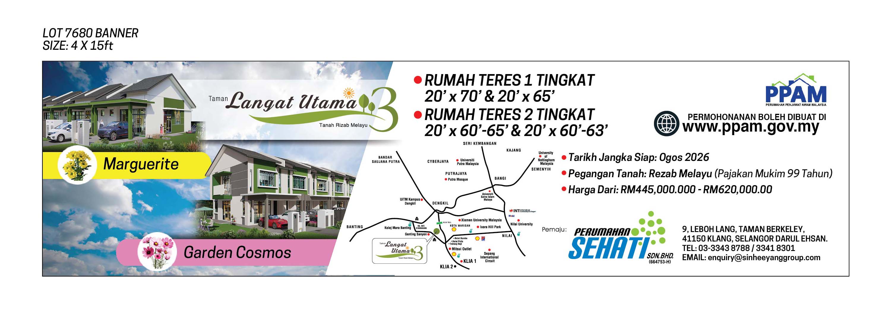 RUMAH TERES 1 TINGKAT (20’ X 70’), JUMLAH BILANGAN UNIT – 32, DARIPADA RM 445,000.00 KE RM 596,600.00. RUMAH TERES 1 TINGKAT (20’ X 65’) , JUMALH BILANGAN UNIT – 16, DARIPADA RM 438,000.00 KE RM 560,200.00. RUMAH TERES 2 TINGKAT (20’ X 60’-65’), JUMLAH BILANGAN UNIT – 16, DARIPADA RM 622,100.00 KE RM 755,500.00. RUMAH TERES 2 TINGKAT (20’ X 60’-63’), JUMLAH BILANGAN UNIT – 18, DARIPADA RM 620,000.00 KE RM 737,300.00. NO. LESEN: 13118/2028/1336(A), TARIKH SAH: 23/11/2023 SEHINGGA 22/11/2028. NO. PERMIT: 13118-14/08-2026/0716(A)-(L), TARIKH SAH: 09/08/2024 SEHINGGA 08/08/2026. PEGANGAN TANAH: PM 12146 – PM 12227, LOT 82751 – LOT 82832 (LOT ASAL 7680). PAJAKAN MUKIM: 99 TAHUN, TARIKH TAMAT PAJAKAN PADA 15.03.2120. SEKATAN KEPENTINGAN: TANAH INI TIDAK BOLEH DIPINDAHMILIK, DIPAJAK ATAU DIGADAI MELAINKAN DENGAN KEBENARAN PIHAK BERKUASA NEGERI. JENIS PEGANGAN TANAH: REZAB MELAYU, TARIKH JANGKA SIAP: OGOS 2026.PIHAK BERKUASA YANG MELULUSKAN PELAN BANGUNAN: MAJLIS PERBANDARAN KUALA LANGAT. NO.RUJUKAN: MPKL/JKB/4/4/58/2021(17)